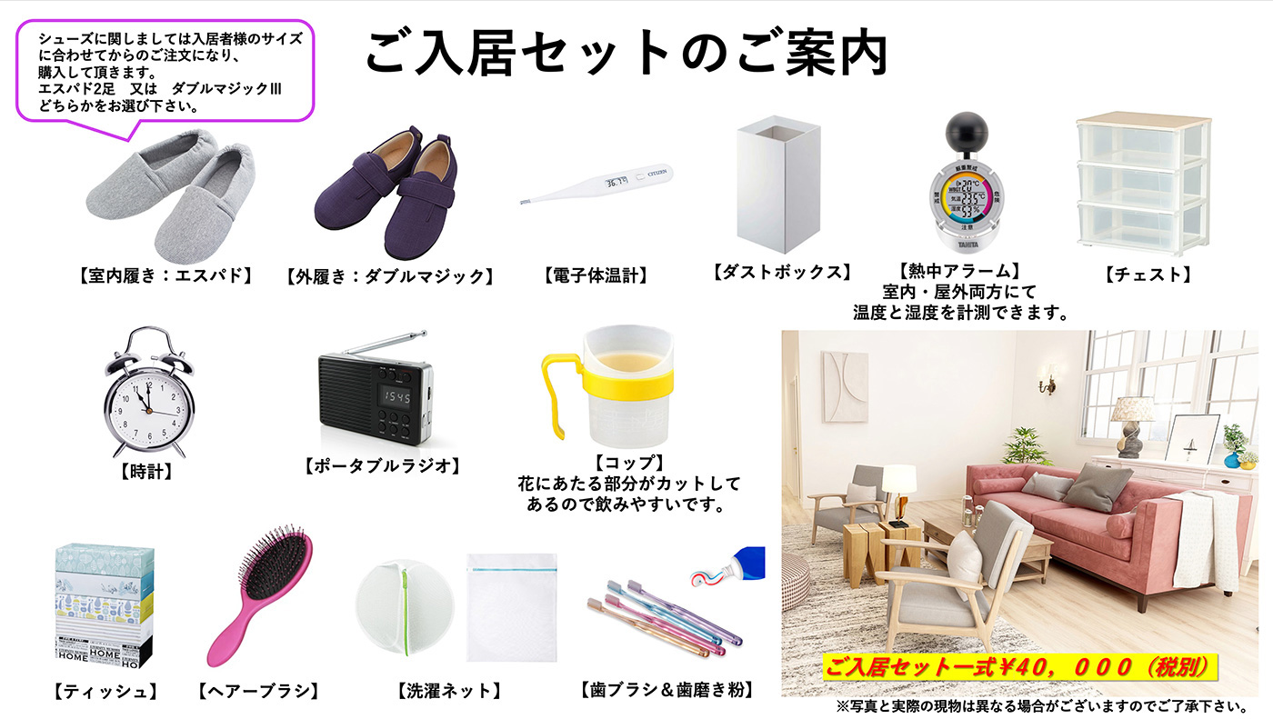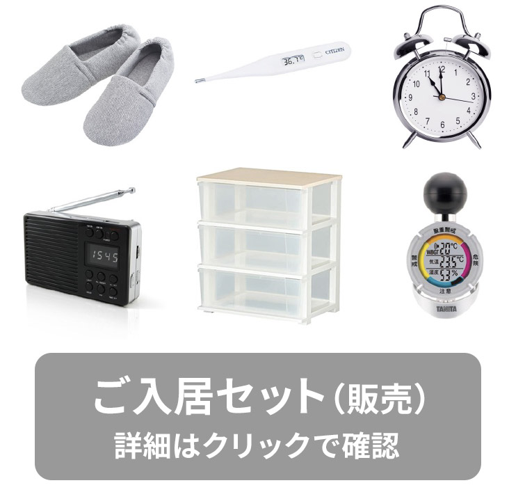 | ご利用背景 | 施設にも14型のテレビがあったが、画面が小さく見えづらくコロナ禍ということもあり、自室で過ごす時間が長いことから小型の冷蔵庫をお借りしました。 また、入居セットは必需品なので買いに行く手間が省け大変助かりました。 |
